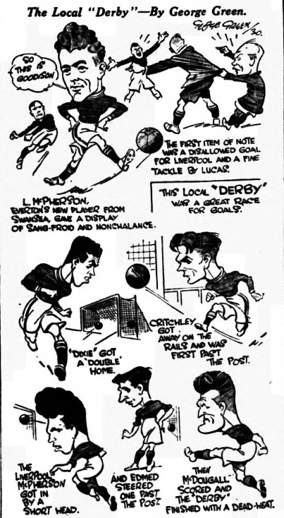 A foul for a push on Hodgson led Hodgson to a header. The linesman who, according to Liverpool, had offended, came into prominence with another off-side decision, (this time undebatable, and strangely enough, Smith nearly got a goal from it, because O'Donnell made a poor length free kick, and Smith. the Anfield centre, was placed for a goal. His shot was fingered round the post for a corner. Edmed in the side net; Smith nearly converted a header by McPherson: and this spasm undoubtedly belonged to Liverpool. . O'Donnell hastily kicked away, but might have passed back and the costly Swansea half - back, McPherson, played in icier manner than McConnachie of years ago ever did: he was as coolest player the game has ever known. Everton rallied back, and when Critchley centred long and low Dean ducked well down towards the earth, and his header, perfectly timed, glided the ball where most people thought Riley had no chance. But Riley reached out his right hand and made a very distinctive save, and moreover, got the ball away. There was a foul against Hodgson on a half, and Cresswell rounded Smith very cleverly. James Jackson made his own goalkeeper save and later stretched out his leg to make a wonderful length kick. Liverpool spectators called for a penalty against Cresswell, for hands. Hart was hurt in a sliding tackle against Lucas, and Robson brought down the Everton house with a series of dribbles and tackles full of football meat. Liverpool forced Davidson to punch away in the last minute of the first half after McPherson had fallen down in one for his nonchalant, carefree attempts to work the ball. I should imagine that the feature of the first half was the way the new McPherson startled the spectators. He did what he liked, when he liked, how he liked, in a game that was clean, sharp, eventful and debatable. Half-time; Everton 1, Liverpool nil.