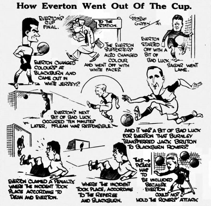 There is no possible excuse or extenuating circumstances in the passing out of Everton F.C. from the cup tournament. They were well and truly beaten in a game where speed, earnestness, football skill and football favour carried a side to a well-earned and worthy victory by four goals to one. The remarkable things is that Everton should have got a solitary goal, for they were not keen shooters compared to the home side, who shot hard and true and fast at nearly every conceivable moment. The one thing possible in the home goal was that the goalkeeper Sagar might have been able to leap a trifle higher to each of the first two had he not been injured in the first ten minutes of play. It is probable that not one hundred of the 52,000 spectators explain why or how Sagar was hurt, as he was nowhere near the ball when a collision occurred. This was really the one foul blow struck during the afternoon in a game blessed with beautiful weather, good turf, and very little wind. It was an elemental kindness suggestive of brilliant exhibition by both sides. Actually neither side did uncommonly well. Everton, save Stein and Sagar, played well below their known form, and without much heart or conception of attacking combination. The half-backs were overrun –the combination of age-experience in the centre, nonchalant winning half-back by McPherson, who is best when he is going upward with the ball, and energy allied to some skill but little weight, as exemplified by Robson, was not comparable to the Blackburn domination, where three towering men went through their game with a definite purpose; they insisted that Everton should have no chance.