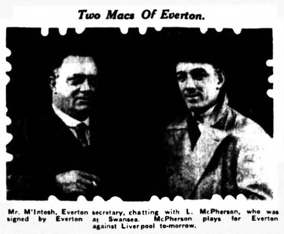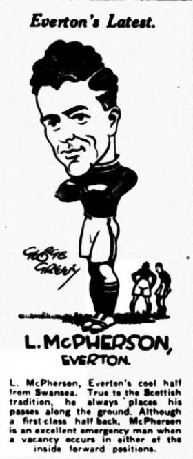 Everton today made an important signing when they secured Lachlan McPherson, left half-back, of Swansea Town. The fee is stated to be a record for a Welsh club. He will play against Liverpool in the Derby game at Goodison Park on Saturday, McPherson, who has been with Swansea for a number of years, and now rejoins a clubmate, Williams, is one of the finest half-backs in Welsh football, clever as he is in attack and defence in the wing half position, he is also a versatile player, and at inside left is a great raider and a deadly shot. Last Saturday McPherson helped his side to beat Hull City by scoring from a penalty. McPherson's capabilities as a forward were discovered when Swansea parted with Len Thompson, their brilliant inside left to Arsenal. At a loss he find a substitute, the management brought McPherson into the forward line, and immediately he began to figure prominently in the goal scoring lost. McPherson first came under the notice at Swansea Town during a tour in Denmark, Notts County were there on a similar expedition. McPherson was playing as an inside forward for the County, but on the particular day Swansea saw him, he was playing left half in an emergency. They signed him, McPherson has played 199 games for the Welsh club and scored 30 goals.