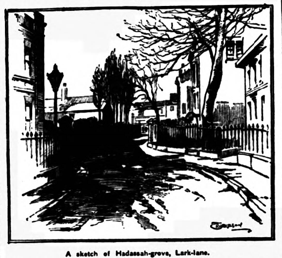 Off Lark-lane, but not of, it runs –or shall I say saunters –a little retreat, and which may be accepted as an instance of a neighbourhood reverting to type after a century of change. The little backwater seems to be a miniature of what Lark-lane was like some time in the early years of last century. Sandstone piers support a gate which looks as if it was last solemnly closed with the fall of the Stuarts, and inside is the rutty path on whose surface the cobble stones come up as in the causeway of a mountain village. A line of tall poplars on either side guard this narrow entrance to “Hadassah- grove.” The title is no misnomer. Unlike so many places styled groves, and which never knew a tree, foliage is plentiful and nooks and crannies are littered with last year’s legacy of fallen leaves. Railings, doorways knockers are like the tracery of the fanlights, all ante-Victorian. After a few yards between the comfortable-looking old houses, the track turns an angle, and you find yourself in a cul-de-sac, where a still more secluded air prevails. Carved stone doorways, which no doubt occasionally open into flowery spaces, are closed; it is as though you had reached the end of a cave.