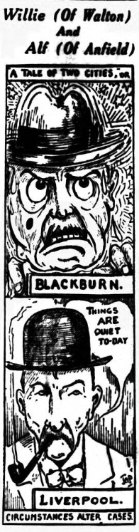 It would be wasteful of time and energy to go into the individual state of the Everton market in the game, except to state that Sagar was brilliant throughout, despite his great limp; and he made masterly efforts to save the first two goals –goals scored by McLean and Bourton. Bruton and Cunliffe, and Martin for Everton, were the scorers. It was a £4,000 gate, with two deaths at the match –one an old player of the Lancashire area –and prior to the game the crowd was kept interested by a boy from Liverpool kicking goals with a sure touch –it made Everton's subsequent attempts seem very puny. I am convinced that Blackburn are lacking in defensive ability and that an early goal against them would show them in a moderate light.