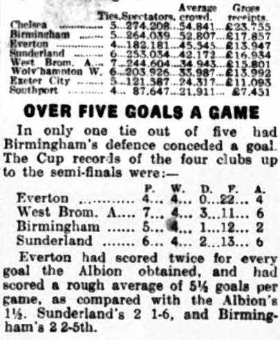 The Everton players have never minimized the difficulty of overcoming either Wolves or West Brom. Everton have already beaten West Brom, twists this season in League warfare, but at the West Brom, ground the game took a turn late on that many spectators believed was not fair to West Brom. At any rate, it left Everton with a 2-1 victory, where many thought a 2-2 verdict should have been registered.  Then they met at Goodison Park, and the standard of play of the West Brom, club was splendid; they fought tremendously hard, and throughout the game they gave a stout exhibition. They were beaten, but Everton players after the game said: "These were tough nut to break” West Bromwich has met Everton twice in the Cup, in 1906 and the following year. Everton won the first game 3-1, and in the next season won 2-1 at Bolton’s ground.