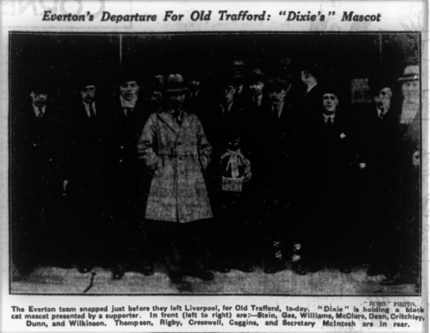 Tommy Johnson, Everton's international inside left, who strained his groin in the international trial match at Highbury, was given a test today, and was found to be sufficiently fit to make his place in the team to oppose Reading at Goodison Park tomorrow. Chief interest in the match centred on Dixie Dean, who requires one goal to complete his second century of football league goals, with Everton Football Club. He has obtained his 199 goals in 194 matches. The ground is in better condition than it has been for some weeks, owing to the dry weather experienced during the past few days. If Everton beat Reading –and they should easily –this will be their sixth double of the season. Reading are certain to make superhuman efforts because they are fighting to escape relegation. Gilhespy, the former Liverpool winger, is suffering from tonsillitis, and his place at outside right in the Reading team will be taken by Davies. Barley deputizes for the injured Featherby. Teams; - Coggins; Williams, Cresswell; McClure, Gee Thomson; Critchley, Dunn, Dean, Johnson, Stein. Reading; Richardson (l); Hodhgkiss, J Richardson; Allan, McNell, Darrnell; Davies, Eaton, Bacon, Barley, McPherson.