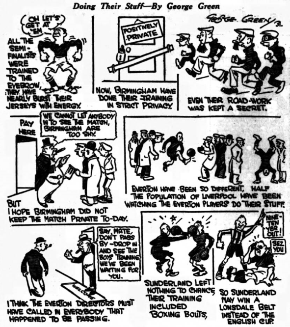 Without being cocksure or conceited.  Everton are taking clubs on the principle of the queue: they take them as they come. Up one, down another: The run of success has certainly been stupendous, and it might lead many a player to imagine the Cup could be swept from the board. But history has always told Everton to mind its P's and Cups. Time was when they looked upon the final tie at Fallowfield against Wolves as a walk-over. They had battered the Wolves with-their reserve men the week before. And the final tie band was arranged and engaged. They were to play “See the Conquering Hero Comes" But Wolves won, and the band played a lament.  After that Everton made it a practice never to engage a hand. When they won the Cup in 1906 no band was engaged, and I imagine they are the only Cup final victors who came back to their town or city without musical honours. You can imagine the drab state of the reception—a roaring Mafeking mob the like of which I have never seen since. The crowds had nought to look upon except the players—no, I forgot; there was some colour lent to the proceedings by the posh attire I was wearing, and by the torches lighted at Goodison Park amid a welter of speeches that could not be heard, that being an age before loud speakers had reached their fine usefulness.  Talking of broadsiding and broadcasting, may I here thank all who have sent me letters about Saturday’s commentary? I cannot hope to reply to them all, but that does not affect my genuine interest in them and my thanks for the praise that is not mere talk lath’ home, but is put down on paper, and therefore means it has become a work.  People are shy of praise when  it entails work, don't you agree?  Everton were not very concerned whether it was Wolves, West Brom, or What-Not. They have always had a sneaking regard for a test with Chelsea, because it was Chelsea that laid them to rest a few years ago, and Sam Chedgzoy, arriving at Lime-street, said: “Do you know, I cannot believe we have lost that Cup-tie. It all seems so absurd." So  the revenge act is conjured up, always  providing Old Trafford gives Everton  their special pleasure-it  once had blows and stick, us—and a lost  purse for a member of the Hive who  journeyed to Manchester and watched  this doleful game!  If we are to go out to West Brom or Wolves, then let it be done with good grace, remembering how many we have put to defeat in recent weeks. I think however, the victory-chart will find another Everton notch.
