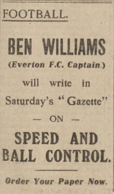 He did not waste one centre during the course of a needle game, and, from observation of most of the games at Goodison this season, there is a niche there he could fill with credit and advantage E.F.C.  Thanks you for your perusal of these comments, I remain, as ever a keen admirer of a fearless critic, “The Bee.”