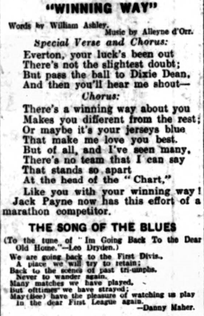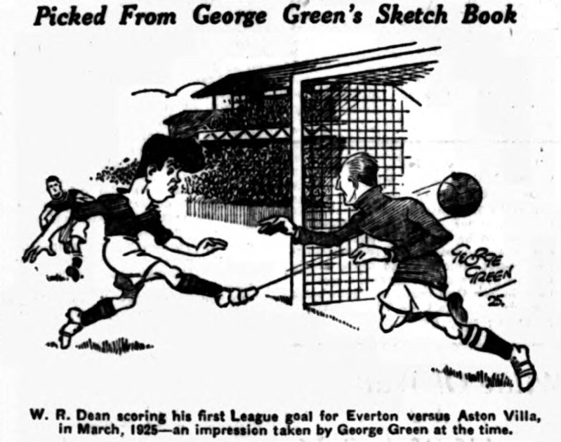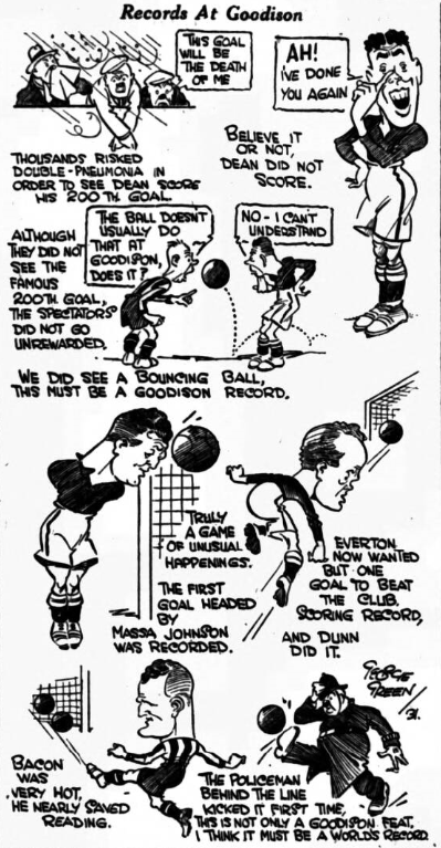 What was expected a fortnight ego is due to arrive to-morrow, and no one will care a fig for jealousies about the goal we are hoping and believing will come to the Goodison Park centre forward, Dean. There have been many quaint arguments about this matter not the least funny being the disgruntled stories of those who had got the figure wrong and if Dean had headed in and scored instead of hitting the upright would have been left without the splendid news. Mike no mistake about it—Dean knows in  nought of his figures end probably cares as little—he has scored 199 League goals in five and a half seasons of football, and that is a performance no one has touched it the History  of football.  It is a feat of amazing length and strength in the shortest possible time.  Hence the desire to see this goal is almost as great as the desire to see him get the finality three in his tot of 60 in the championship year.  As a drawing power and a magnet Dean is unequally, even if one doesn’t desire to make fish of one player and small fry of the other ten.  There is no spirit of jealously in the Goodison Park camp; they all know the value of the man and his game, and this will not deny us paying tribute to the eleven in all the successes they are obtaining this year.