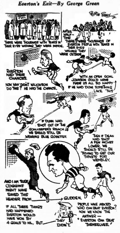 Everton are finding time to bring in some of the joyful touches of football to brighten up these wintry days. The back-heel lies come into it’s own-always a good move it not overdone; always a good move as Buchan showed its so many times. Yet it had gone into the lumber-room as if never to be dusted for special occasions. Now we find it resurrected. Dunn treads over the ball, lets it go through his legs, does little antics that make us smile and don't harm the opposition in a vexatious spirit; Dean used the back-heel, and generally speaking, he did everything a class centre-forward should do and can do. His header was surely the most marvelous of all the goals, and that he got four only half tells the spirit of his play; the command of his foot and head and the way he gets his body in front of a defender and blot him out—either in view or touch of the ball. It is all highly interesting and yet you cannot separate the whole team.  Coggins was doing his big stuff in the first three minutes—three saves that stemmed the port of Southport. So Everton sailed into the semi-final port, and mayhap they will get their wish to  play Chelsea, and thus be able to work  off another revenge act—the season has  been full of them, most of them in the last half of the season.  Considering the state of the weather and the, ground, and the fact that rumour went round the city that there would be no play—this was officially denied, in the " Echo" bulletins hour by hour before the game—the attendance was really wonderful—Southport shared a gate of £4,000, and prior to this round their gross takings at cup-ties had been less than £4,000. Good fortune goes with a sporting and able little side, they need shed no tears over this defeat; everyone admired the way they plugged on to the finish of the day's grueling task.  Would any First Division side have stood up to the tank any better? I doubt it,