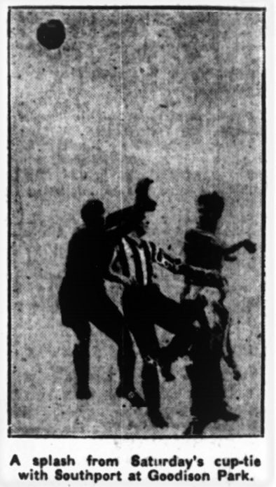 Southport bade a very bad afternoon to the English Cup when they let Goodison Park's snowflakes on Saturday, after having engaged in a very captivating game, and paid their respects to the team that beat them handsomely and without venom. They scored 9 to 1. I do not think Everton would have scored so many, but Southport got a move on after the interval, took a goal by their regular member in the score sheet –Waterston –and Everton thought they had better take no chances with a team that had been named as a shock side competent to upset the best of opposition. Everton have never gloated over their victories or their margins; they take enough to ensure safety and then "play." They intended to do this after they had made a lead of seven before half-time, but Southport never ceased their effort, and at times they looked like a very sharp side; a good side; a side with much speed and more pluck and daring. But they played the right sort of football, never condescending to touch the Third Division style as many know it, so that they were to be congratulated upon their methods and upon their keenness.