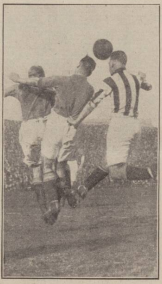 Dean got four goals, Dunn two, Critchley two, and Johnson got the other apart from Waterston's consolation stroke. And the best was probably Dean's master header to make the eight goal of the day. I don't remember a senior match were seven goals lead has been taken in the first half, unless we go back to the days of the 26-0 score put up by Preston North End against Hyde. Certainly Everton are collecting goals with a rare freedom, and this year to date they have scored 53 goals in cup and League. They make the game look frightfully simple and simply effective by means of the positional play of the line, each of whom has a fine understanding with the rest of the side, what time the half-backs join in with their fine passes along the ground. McClure was hard, Gee was a dribbler, forrager, and joyful playmate of the man in front of him; he gave him a squeezed in pass to make one of Dean's foursome goals, and Stein kept his best for the later stages, when his centring was full of judgement.