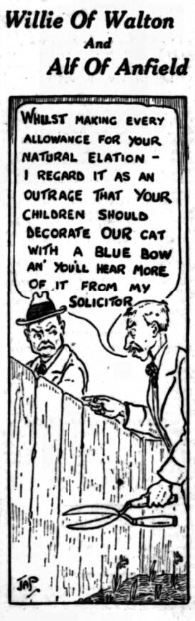 Certainly, sir. You are not alone in talking or writing of this picture freak.  Actually what happened was this: The inspector of police is bending forward with the figure of Mr. McIntosh, the secretary, just at his side. Behind is a player (Cresswell, I believe it was) coming up the steps. You see his step and that is all the film permits of the view of Creasy. But the inspector bending forward allows the view of a leg, and thus you get the "Lloyd Hamilton" look of the legs of man!  It is odd, but not so odd when you remember that the players are coming up the steps and that the second player is apparently going round the back of the inspector and Mr. McIntosh.