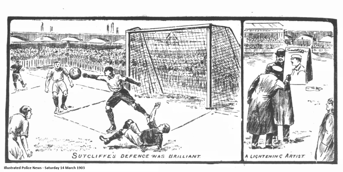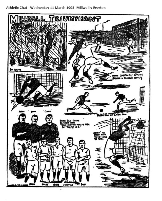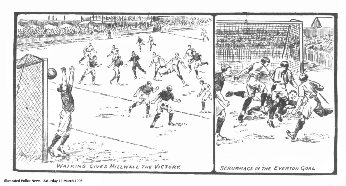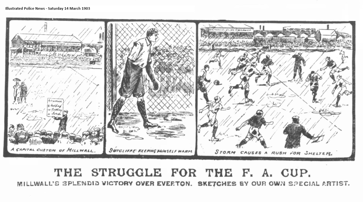 This match was played in miserable weather at Millwall, before a crowd of some 12,000. The ground was against good football. Millwall turned out first, amidst enthusiasm. Everton were soon out. Millwall won the toss, and Everton at once commenced to press severely, and caused Sutcliffe a lot of anxiety, only the dreadful state of the ground preventing as score on several occasions. Millwall made some good breaks away, but the defence opposed to them too strong, and play was nearly always round the Millwall goal. Then Millwall pulled themselves together, and showed much better football. Moran on the outside right, falling over when right in the goalmouth. Everton again took up the running and for several minutes simply bombarded the Millwall goal, Sutcliffe saving well by conceding a corner, which was cleared from the goal. Half-time; Millwall 1, Everton 0. Result; Millwall 1, Everton 0.