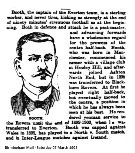 At Derby, before 5,000 spectators. Everton were well represented, but Derby were without Goodall, Bloomer, Morris, and York. Derby won the toss, but Everton had the best of the opening exchanges, and Fryer early on had to save from Sharp, Settle failing at comparatively easy chance from the custodian's partial clearance. Everton had a distinct advantage on play, but Derby retaliated well, and Kitchen had to negotiate a long shot from Warren, who just after shot past. Play was even after this but at the end of 30 minutes' Ratcliffe conceded a corner, from which Booth headed through,'the ball striking the bar before going into the net. Derby attacked after this, and Davis put behind, whilst Varney failed to accept a fine centre from Richards. Sharp broke through, but .wound up shooting into Fryer's ' hands, and Derby went back only see Varney shoot behind. Everton played the better football. Half-time—Everton 1. Derby 0. In the second half Derby played a much better game against the wind, but though Davies put in many fine centres nothing came of them. Fryer on the other hand saved several times in fine style, one from Taylor being particularly clever. Neither side scored again, and Everton deserved their victory. Result; Everton 1, Derby 0.