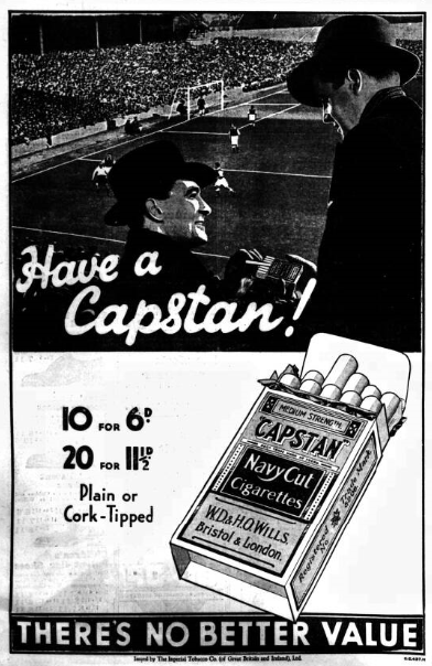 • Advertisement in Evening Express. League Match at Goodison Park, Easter Monday. Everton v. Leeds United Kick-off 3.15 Admission 1/- Boys 4d, Stands extra (including tax) Booked Seats, Sharp's Whitechapel.