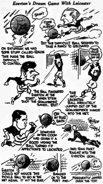 Leicester are due to meet Everton tomorrow at Goodison Park, and local enthusiasts will be able to judge the merits of the Cup semi-finalists for themselves. The City are undoubtedly one of the most improved sides during recent weeks. Reconstituted from Leicester Fosse in 1919, the City gained promotion to the upper circle in 1925, and they have since held their place. The City first appeared at Goodison park under League auspices in 1908-09 and suffered a 4-2 reverse, and at the close of the same season were relegated. Since their return to the upper division their visits to Everton have produced four points as the result of two victories while they have registered 15 goals and conceded 32. The results of these latter games (Everton's score reading first) have been; 1-0, 3-4, 7-1, 3-1, 4-5, 9-2, and 6-3.