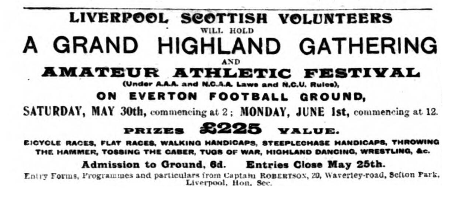 The arrangements for this popular event, to be held to-day and on Whit- Monday, at Goodison Park, Everton, under the auspices of the Liverpool Scottish Volunteers, the Caledonian Association, and the Scottish community generally, are now completed. Should the weather be favourable, a most successful gathering may be anticipated, as numerous entries have been received in the competitions. The Lord Mayor has kindly promised to preside on Monday, when the sports will commence at noon, and General Hallam-Parr, commanding the North-Western District, has given his patronage to the gather and will probably also be present on Monday. The commencing hour to-day is two o'clock. For the various competitions about 400 entries have been received, comprising many of the leading and best-known athletes in the country. In the dancing competition the principal prize dancers of Scotland will appear, and this will certainly be one of the most interesting features of the gathering as opportunities are not often afforded at athletic sports to witness a competition of Highland dancing. The entries in the competition for bagpipe-playing are equally satisfactory, some of the most noted pipers in Scotland having signified their intention of competing. In the open tug-of-war there promises to be a most interesting and exciting struggle, the entries being more numerous than is generally the case at such meetings. Ten teams will complete- namely, Liverpool, Bootle, Manchester Police, 1st Royal Garrison Artillery, 5th Irish, Liverpool Scottish, Bellman’s team, London and North-Western Railway team from Birken-head, Macfie’s Sugar House team, and the Liverpool Warehousing team. The walking competition, no doubt owing to the prevailing craze, has brought forward a large number of craze, has brought forward a large number of entries and will doubtless afford considerable amusement to the spectators. The distance will be one mile, and amongst those who have entered are two gentlemen aged respectively sixty-five and seventy-four years. In the high jump competition several celebrated jumpers will appear, one of whom, it is stated has to his credit the exceptional jump of six feet. A feature of Monday’s programme will be the 1,000 yards steeplechase, for which a difficult water jump is being prepared. The entries for this event comprise representatives of the West Cheshire Harriers, Sefton Harriers, Liverpool Pembroke Harriers, L.H. and A. C., Farnworth Harriers, &c. The purely Highland game will be very strongly represented; in fact it is stated that probably the competitors in these will be much more numerous than at many of the Highland and gatherings in Scotland. This part of the programme comprises tossing the caber, putting the shot, and throwing the hammer. There will also be bayonet exercises and other features of a novel and interesting character. In the great exhibition the principal exponents will be Tom Cannon, Tom McInerney, and Joe Carroll, and they may be depended upon to give a fine display of scientific wrestling. Munro, the well-known Scotch wrestler, had also intended to be present, but he has written to inform the committee that he is unable to come owing to a recent injury to his back. On both days music will be provided by the band of pipers of the Liverpool Scottish. The ground is being profusely decorated, and arrangements have been made whereby refreshments will be obtainable in all parts of the en closure. It is probable that there will be a unique display of the Highland costume, as not only will the members of the Liverpool Scottish appear in the dress of the regiment, but it is stated that many other Scotchmen resident in the city have on this occasion expressed their intention of wearing the national costume, and this will without doubt add greatly to the picturesqueness of the scene. The arrangements made by the committee of the sports, with Captain Robertson, adjutant of the Liverpool Scottish, as the indefatigable hon. secretary, are most complete in every respect. At the final meeting of the General Committee on Thursday, it was reported that the Tramways Committee had refused permission to post placards on the cars going north directing the public which cars to take for the sports. It was pointed out that this privilege had heretofore been accorded in connection with events of a similar character, and the action of the committee was warmly commented on, as no good reason appeared to be given why the privilege was denied.