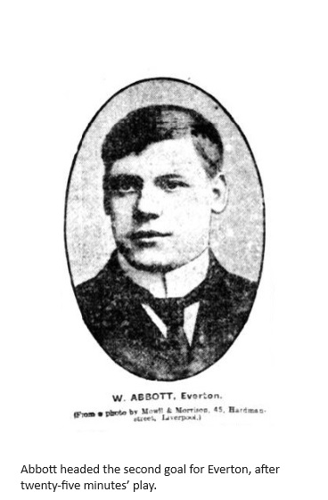 At Goodison Park. The home side had most of the play, Darwen's backs showing splendid defence. Rankin tried many shots, the interval arrived with no score. During the second half, Everton had the best of the exchanges, but bad shooting spoiled all their efforts and the game finished with no goals. Everton: - Whitley, goal, Wildman, and Murray backs Taylor, Russell, and Makepeace, half-backs, Rankin Sheridan, Dill O'Hagan, and Simpson, forwards.