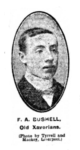 One of the most promising of our amateur goalkeepers-and there are not many who aspire to first-class in this position –is Francis Albert Bushell, who holds the keeps for the Old Xaverians.  He was born 21 years ago in Liverpool, and received his earlier education at the famous St. Francis Xaviers Colleague.  He finished his career at the French Colleague, Blackrock, Dublin, and as at this latter place “soccer” football was tabooed, he had to study the Rugby game.  In the first season he won his place in the Colleague Cup team, and his school won the School Challenge Cup which, it may be stated, was obtained eleven years in succession, and without doubt the school were one of the best Colleague teams in Ireland.  Bushell played full back, and retained his place.  After leaving colleague he played for the Old Xaverians, but went over to the Liverpool Caledonians for whom he did good service and this team won the Pyke Cup with a goal average of 13 goals to 1, for which feat Bushell holds a medal.  On being invited to rejoin his old club he willingly did so, and has this season exhibited good form in goal.  He is cool, resourceful, and fearless, and has all the makings of a capable goalkeeper.  Equally clever with high and low shots, he has a penchant for saving penalty kicks.  He stands 5ft 8ins, and weighs 10st.  Last season he assisted Everton in three of their Combination matches, and I believe had the opportunity of playing with a Southern League club this season, but he decided to stay at home, and retain his amateur status.  He does not confine himself to football, for he is an enthusiastic cyclist and a member of the 1st V.B. King’s Liverpool Regiment.  He holds the unique position of Sergeant in Charge of the Cyclist Ambulance Section, which is, I am informed, the only one of its kind out of London.