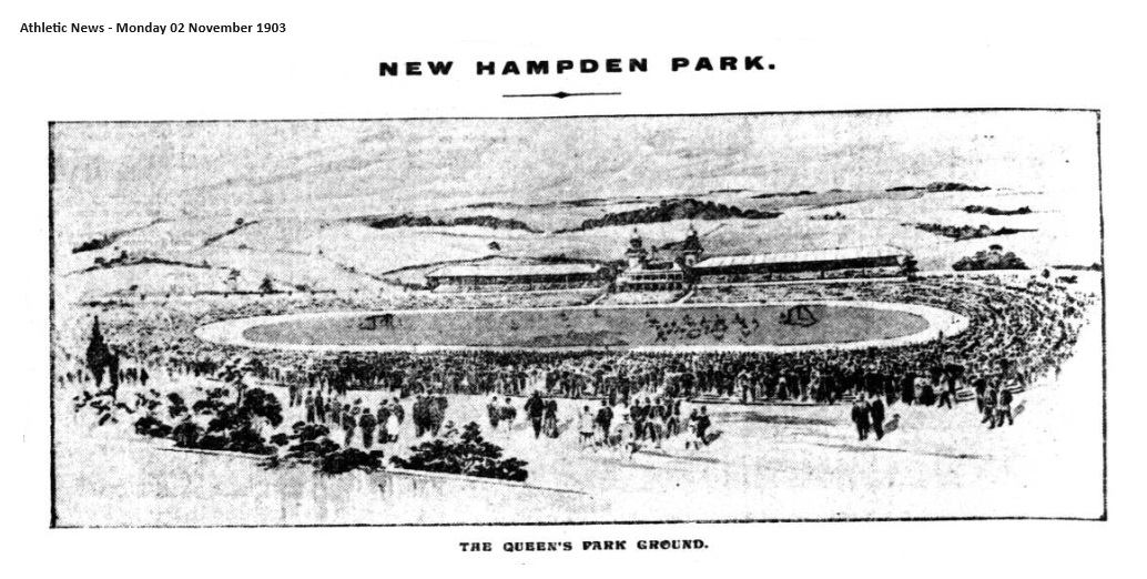 A company of pressman specially invited by the Queen’s Park F.C. Executive last week viewed the magnificent new enclosure which the famous old club has built for itself among the hills of Mount Florida. I (write our oldest contributor, “Jonathan Oldbuck”) was of the party, and gazing on the enormous expanse of field and terracing, with the grand stands (as yet incompleted) rearing themselves skywards, I could not prevent some pictures of the past forming themselves in my mind. It does not seem like thirty years since we followed the fortunes of the noted black and white brigade on the modest enclosure which was their first home. How primitive were the appointments viewed in the light this newest Hampden, yet how suitable to the requirements of the time. The Fourth Estate had then none of the comforts afforded nowadays at any first-class football ground—indeed. I rather feel that the sporting scribe at that period was more tolerated than welcomed. Spectators and players stood on the same level, and a single rope did duty as the line of demarcation between the field of action and the shouting hordes. Note-book and pencil in hand the diligent reporter followed the play up and down the touch-line, often compelled to suffer a storm of serious and witty anathemas from the spectators behind. The playing pitch at New Hampden is a picture of level pasture: on that oldest Hampden the grass was also green, but there were ridges and furrows between the goals, which played divers tricks with well-intentioned touches at the ball. Yet the players thought it first-class. It was on this historic ground that the London Wanderers played their first and only match in Scotland, and three, if not more, of the Queen’s team (C. Campbell, T. Highet, and H. McNeil) were conspicuous in Saturday’s ceremonial. In October, 1894 Queen’s Park entered second Hampden, of the classic slope, and now, after 18 years’ occupancy, they leave it for what is intended to be their home for all time. May their light never grow less. Of course, the enclosure is not yet quite equipped, as shown in our picture, for the pavilion between the stands has yet to be built. That, however, is a detail which time will conquer.