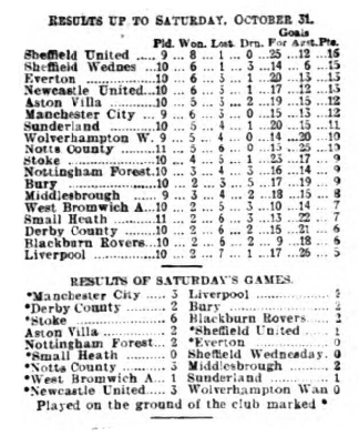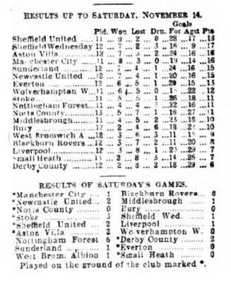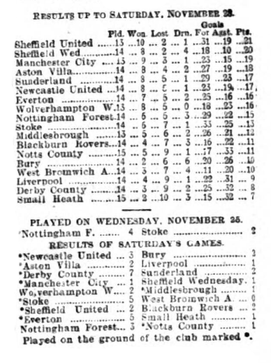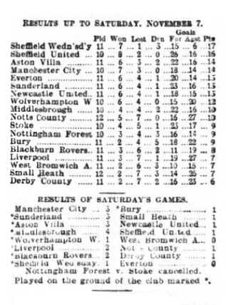Small Heath visited Goodison Park to meet Everton. The home side had won a fairly comfortable position in the League table, and everything favoured their success. Half an hour before the time fixed for the start a November fog gathered suddenly over Goodison Park, accompanied by a drizzling rain. There was great doubt whether the game would be started, but the haze lifted, and punctually to time the players came out. There were about 10,000 spectators to-day when the players came out. The Heath, it will be noticed, were without McRoberts and Wilcox, but Leonard reappeared, playing inside left.