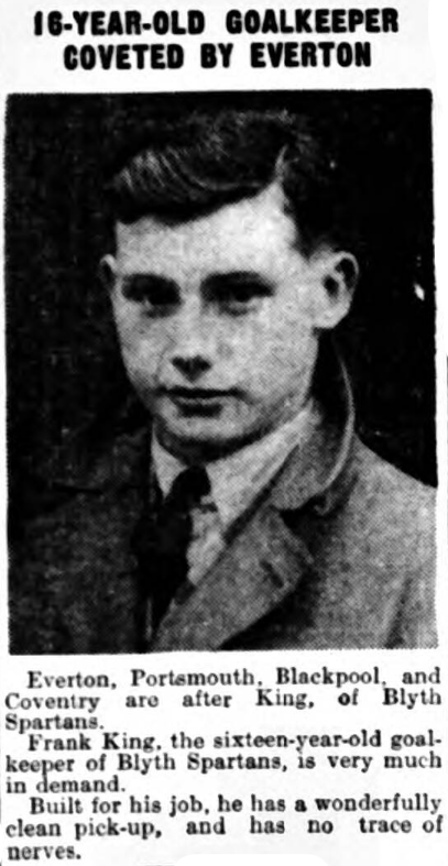 Everton have secured the signature, on amateur forms, of the boy who is considered to be the most promising goalkeeper in the country. He is Frank King, of Blyth Spartans, who being only 16 years of age, cannot yet become a professional. He will be employed on the ground staff at Goodison Park until he reaches the age when he may put pen to a professional form. King has been sought by several League clubs, but, as forecast by the Evening Express North Eastern Correspondent. Everton were always favourities for his capture. His is stated to be an agile keeper, quick to take up position and revealing fine anticipation. Everton have secured many fine players from Blyth Spartans, and the Watson (T and J) at present on their books came from the club.
