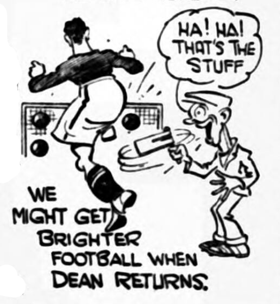 A number of the Everton players were looking on, and there is a general “tonning up” of Everton through the announcement of Dean’s return to the field on Saturday next. It is the celebration Day- a game v. Huddersfield; White at his old post, Dean leading the team, and the chairman Mr. W.C Cuff, getting set at night at exchanged Hotel. It looks like being a full house at the presentation, as I am told the number of acceptors of the invitation to be present is over 300.