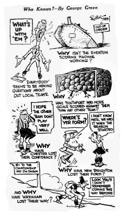 Things are moving on Merseyside football grounds. There has been a call to this office, this day about a Scottish half back of fairly long service with one of our clubs. Stevens has gone to Southend, where he would not go to Southport a year ago. He was signed afresh through domestic affairs, and everyone hopes he will do at Southend what he was unable to do with Everton. There are other movements on foot in our city, of which more anon. Sufficient is it at this moment to say that Everton have travelled much, travelled far, and they have not gone in vain. The need of their moment is too patent for words. And they can only take the best; anything tawdry would only be adding to their troubles of the future.