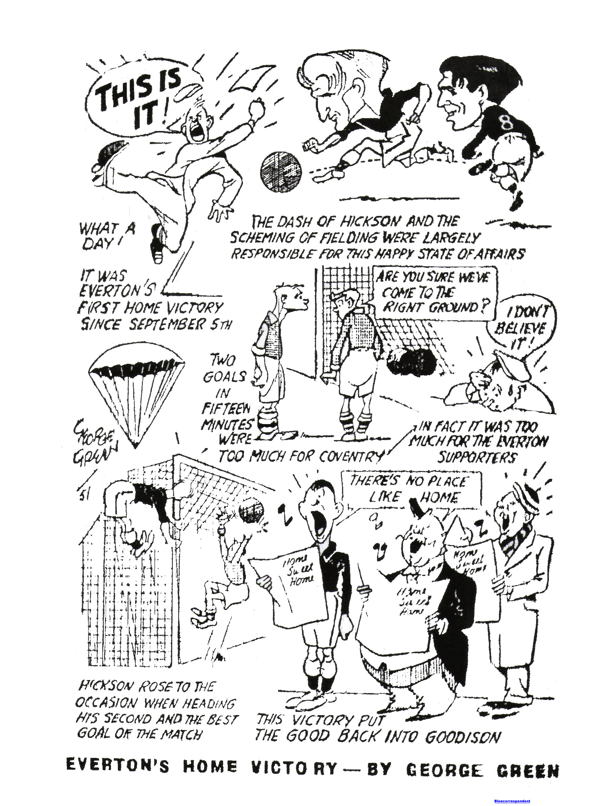 It was grand to see Everton slap on four goals into the Coventry net at Goodison Park, on Saturday, and thus lay their home bogey, which has been worrying their supporters. It was heartening, but I would advise those who think this victory is the end of Everton’s worries to hold their cheers. True, they deserved their win, but I am not unmindful of the fact that Coventry had their centre half back McDonnell injured after twenty minutes and a passenger for the remainder of the game. Everyone knows what it means to break the balance of your machine; the other cogs fail to run smoothly; extra strain is placed on them and eventually tells its tale. City were just recovering from the shock of two quick Everton goals when McDonnell met with his mishap. In Hickson Everton have found a striking force who can keep his line running nicely. But he alone could not have done what he did. He had a Fielding and a McNamara to aid him in his work. Fielding is at the peak of his form. He and McNamara framed both Hickson’s goals, the first in 30 seconds; a brilliant shot to the far side of the goal; the second a header worthy of a Dean. McNamara an Parker scored the other goals to show us that there is more power in the forward line, in fact there are indications that the policy of youth is going to pay dividends. There is still a hard road to travel, but Everton are putting their feet down more firmly than hitherto. It was a fast game without being a classic. Coventry were full of enthusiasm and endeavour but they never had the skill of their rivals although they made one or two calls on Leyland. In the main Everton defence was equal to most calls. There was one exception. When McDonnell took a free kick, Leyland came rushing out to punch away only to miss it and so let in Chisholm to score. For the record here are the goals; Hickson (30 seconds), Parker (15 minutes), Chisholm (22 minutes), Hickson (42 minutes), McNamara (65 minutes).