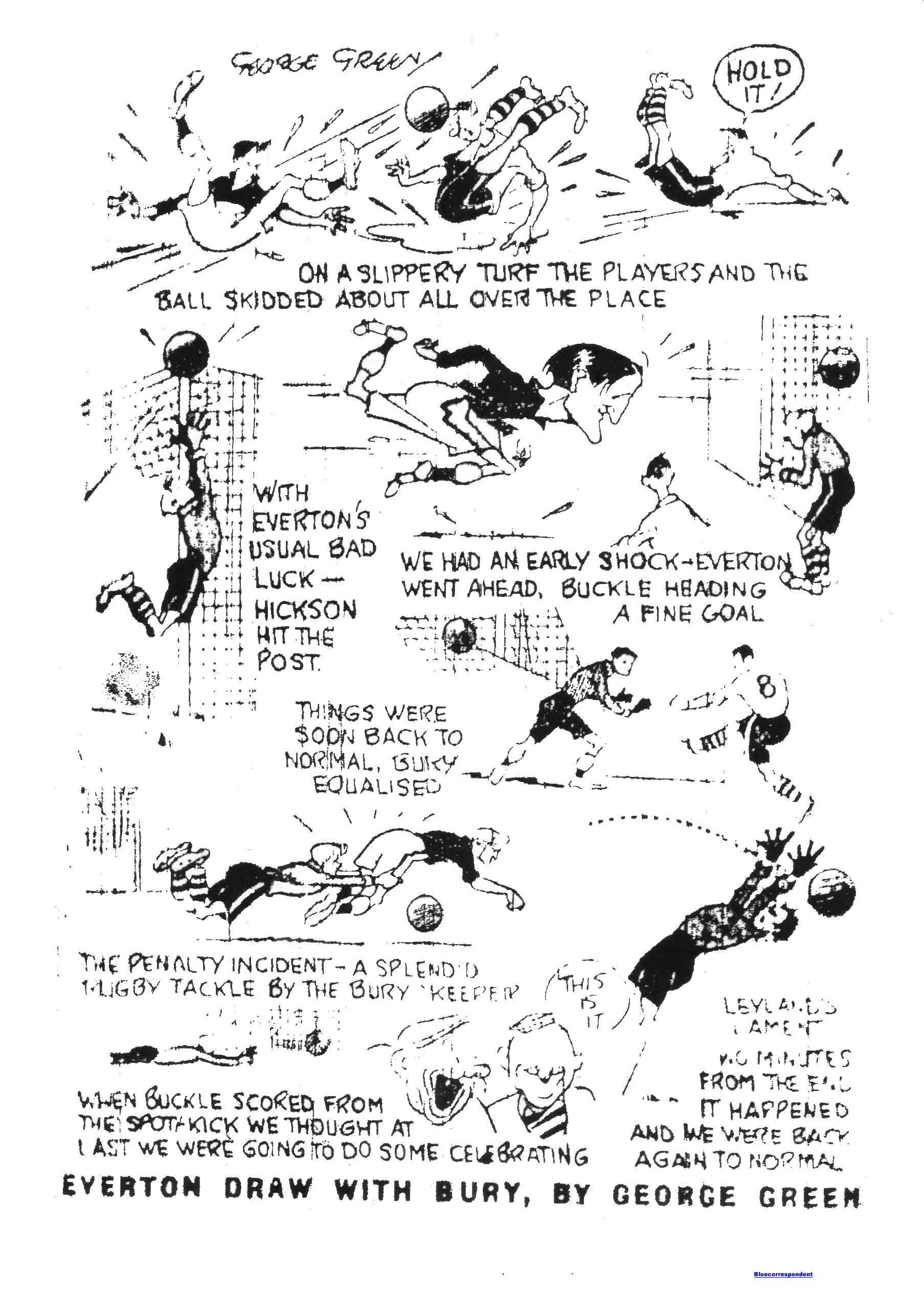 Plant gave Leyland a hasty ball to deal with and Buckle failed to seize an opening. A long ball from Tommy Jones puzzled Goram so much that he decided to give away a corner rather than take any undue risks. Goram, having made another save tried to throw the ball out to his wing half, but it stuck in the mud, Hickson came down on him like a ton of bricks but Gorman was able to clear. Fifteen minutes from the end Everton were awarded a penalty when goalkeeper Goram threw himself at Hickson and almost knocked the legs from under him, Buckle scored from the spot at 79 minute. This was a blow to Bury and a joy to Everton but there was still some time to ho and Bury took up some of it by hitting back. Just when an Everton victory seemed certain, Leyland made the biggest mistake of the game. He allowed a shot by Bardsley to pass through the hands over his head into the net. He knew he had tried for he dropped down on his knees in despair. I notice he received a pat on the back from the captain Farrell as he went down to the depths. Final; Everton 2, Bury 2.