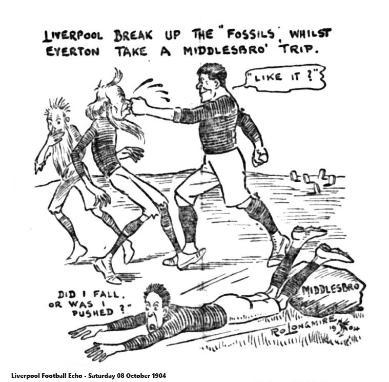 In losing at Middlesbrough on Saturday, Everton only bore out previous experiences. Including the game under notice, they have on three occasions participated in league encounters on the ground of the northern club and it is rather remarkable that they have not yet succeeded in scoring even a goal against the Teessiders. Their record certainly does not afford pleasant reading seeing that they have been defeated by 1-0, 3-0, and now again 1-0. There is nothing in the nature of the ground itself to account for this lack of success, and apparently the cause is to be found in that inexplicable fatality which appears to follow certain teams when figuring on certain grounds. While for the third time this season Everton succumbed away from home, it is worthy of note that on each occasion an odd goal has sufficed to gave the maximum points to their opponents. Even admitting the strenuous work of the home side, the Goodison Park eleven need not have left both points behind them had their force been in anything like decent form when in front of goal. Indeed, the keynotes of the defeat was furnished during the first half, when with the sun and the wind in their favour, more than one glorious chance of placing the ball in the net was it, some unaccountable fashion thrown away. Probably the fact that Middlesbrough had not opened the season in a manner to please their supporters had not a little to do with the extra effort they put forth to regain favour. At the same time, it was in no small measures owing to Everton's inability to turn to advantage numerous openings which occurred during the first half of the game that buoyed up the Middlesbrough side and eventually led to victory, which was as pleasing to the northern club as it was disappointing to Everton. Once again the Evertonians were handicapped by the absence of such men as Sharp, Booth, and Abbott; but against this they enjoyed the services of their latest amateur recruit S.B.Ashworth, who, it must be said, made a distinctly creditable debut with the club of his adoption. With the amateur filling the right half position, the ubiquitous Taylor was called upon to fill the position which Tom Booth for several seasons past has made his own. In this unaccustomed role the veteran rather surprised those who know his work best by the aptitude, which he displayed and by the restraint he placed upon himself in keeping to his own position. Undoubtedly he did capital work, and with an improved exhibition by Makepeace, the half-back line could in no wise be blamed for Everton's defeat. Neither could the backs of the goalkeeper come under the ban of adverse criticism, for their work throughout was neatly and cleverly accomplished. As has been indicated, what blame there was attached to the forward line. There was not that combination, nor even individual efforts which one expects from forward of the ability possessed by those now serving the Everton club. Hardman was far and away the best of the line, and it was a pity that his skilful and lion hearted efforts were not supplemented by his colleagues. He had a particularly vigorous customer to deal with in Hogg but nothing daunted, he was always after the ball, and he had the satisfaction of troubling Williamson almost as much as his four colleagues put together. Rankin and McDermott were by no means so effective a wing as in the last away match at Newcastle. At times they were clever enough, but there was wanting just that little extra effort which is all important in these days of fierce League competition. Young was evidently off colour for he failed not only to utilise chances, which came his way, but to render that assistance to his wings which one reasonably expects from a class centre forward. There was nothing of a scientific character about the play of Middlesbrough; they rely almost entirely upon dash and vigour and, although there was a suspicion of offside about the goal which gave then the victory. On the general run of the game one could not begrudge them their success.