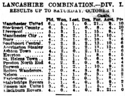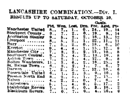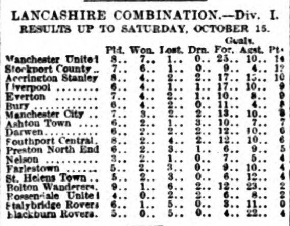 A dull and uninteresting game was seen at Goodison Park between the Everton second string and Stockport County. The visitors scored the only goal of the match before the interval. Green being responsible for the point. In the front line Everton shaped wretchedly, there being an utter lack of combined effort. For the visitors, Green and Bardsley were the most prominent forwards, and of the backs, Heywood and Butler accomplished some creditable work. Everton are by no means playing like champions, and judging them from their form this season they will have to relinquish the title.