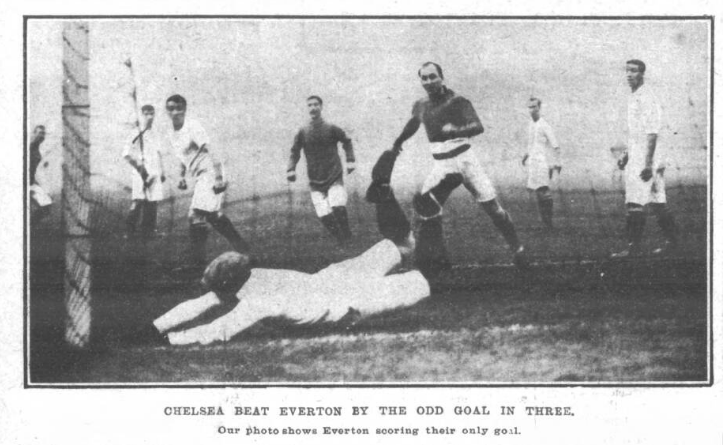The story of the game can soon be told, for the first half all the exciting football was witnessed. From the beginning play was contested at a fast pace, and the Chelsea goal was early in danger with Millar miskicking. Fortunately for the Pensioners Cameron dropped back just in time to prevent Bolton getting in his intended shot. Only five minutes had gone when Chelsea registered their first goal. Cameron had cleared an ugly rush by Settle, and Hardman and from his long kick Hilsdon fastened on the ball and passed it prettily to Windridge, who taking a quick shot, beat Scott at close range. There was a very exciting incident, after this for Bolton trapped a beautiful centre from Hardman, and flashed in a lovely shot which Whiting negotiated by literally throwing himself at the ball and conceding a corner. The most noticeable part of the game up to this period had been the beautiful work of the Everton half-backs. Their steady tackling and accurate passing to their forwards was much admired by the great crowd, but somehow they seemed to fall, which they got within shooting distance. Chelsea went in for more dashing tactics, and most of their movements were engineered by Rouse, the old Everton man, who was playing his first home match for his new club. Windridge and Fairgray instituted many thrilling movements, but it was left to Everton to provide the excitement of scoring an equalising goal. The forwards had indulged in a regular bout of passing, and finally Bolton took a shot at goal. His efforts, however, cannoned off Millar and went out to Sharp, and the Lancashire cricketer cantering along, dropped in a backward centre. The ball dropped at the feet of Booth, who, from a distance of quite 20 yards, sent in a low, swife shot which completely beat Whiting, whose sight was obstructed by his backs, Young almost got another in the next minute, but Cameron just managed to charge it down. Before the interval Chelsea, again took the lead. Rouse got a pass from Stark, and hooked the ball out to Morgan, and racing down the field he was successfully lackled by R. Balmer, but before the Everton back had time to clear, the little Chelseas winger had registered possession. He immediately patched across a curling centre, which Scott came out to meet, but the ball swerving out of the custodian's reach went to Windridge, and in a twinkling it was breasted into the net. As it happened this proved the winning goal, for the second half was devoid of scoring, though Everton came very near on several occasions. They pressed almost continuously during the last ten minutes, and Whiting, magnificently turned one great shot from Sharp, round the post. It was a wonderful piece of goalkeeping, and the crowd fairly rose at Whiting after he had seen Abbott head over the crossbar from the corner kick.