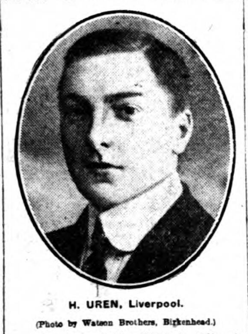 Harold Uren, who save gave a smart display on Liverpool's left wing last week, comes off a good family stock, and only entered the professional ranks a comparatively short time ago. A native of Clifton he came to Liverpool when only four years of age. Educated at the Liverpool Institute, Uren showed an early fondness for athletics of a manly character —especially football—and eventually lent assistance to the New Brighton Wesleyan and West Kirby clubs. It was in season 1907-8—when he had just attained his majority—that the Liverpool club succeeded in obtaining his assistance as an amateur, and it was only a month or two later- November 1907- that was called upon to deputize for Arthur Goddard at outside right in a Senior League match. ‘Twas at Hyde-rd., and the debutante most favorably impressed the critics on that occasion. A week later he made a commendable substitute for Cox on the other extreme v. Preston North End. His only League match in 1908-9 was v. Everton at Goodison Park. It was about this period that Uren decided to join the professional ranks, without, however, sacrificing any of the elements which go to make up the gentleman. In September of last year it was thought by many that he would be Liverpool's opening choice for the outside left position, seeing that Jack Cox had severed his connexion with the club. But the new Scotsman, McDonald, shaped so well alongside that goodly coach -Ronald Orr —in the practice matches that Uren perforce had to again adopt a waiting policy, and his League turns only totaled three. This season McDonald has disappointed somewhat, and thus Uren proved first choice of week ago, when he gave a most promising display. He is speedy and prompt; a good dribbler and a hard shot, while a feature of his play is an ability to feint and swerve when in possession. A capital cricketer also is he. Standing 5ft 10ins, and weighing 12st., Uren promises to go far.