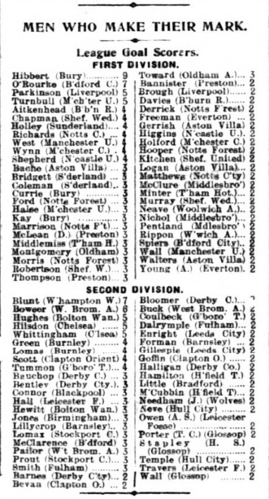 At times the play was rather slack, but on the whole it was interesting. On the Everton side Scott distinguished himself by some smart saves, whilst Balmer and Macconnachie were able defenders. Harris was the best of the middle line and Gourlay and Freeman did well in the front rank. The wingmen preformed fairly well and Lacey was a hard worker throughout. Morley and Beare were the best of the home line and Connor was the pick of the halves. Teams: - Everton: - William Scott, goal, R. Balmer, and Macconnachie, backs, Harris, R. Young, and L. Davies half-backs, Pinkney, Lacey, Freeman, Gourlay, and Mountford, forwards. Blackpool: - Fiske, goal, Crewdson and Dale, backs, Threlfall, Connor, and Clarke, half-backs, Hoad, Wolstenholme, Morley, Conne, and G. Beare. Forwards.