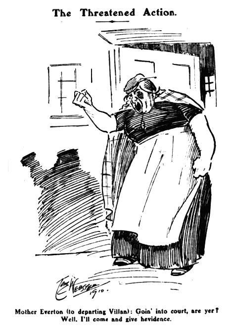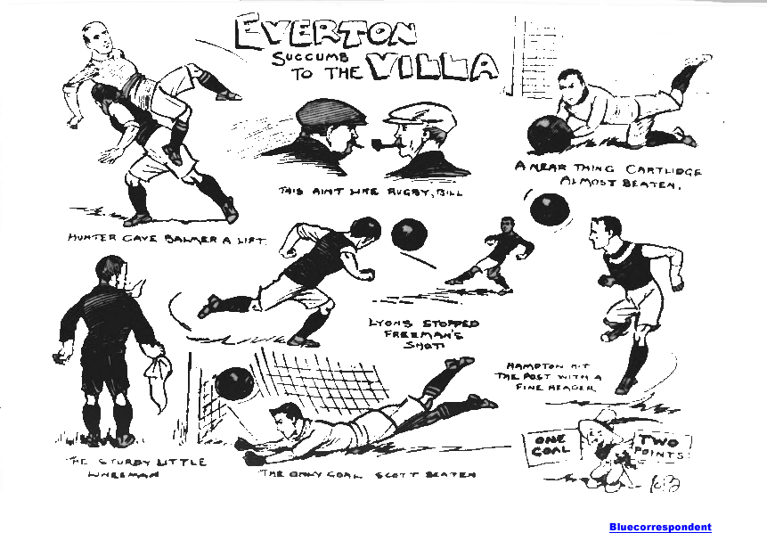 Not until the second half had started did we see the Villa forwards to advantage, and then only for a brief period. This, however, was sufficient to produce the only goal of the game, and furnished the most effective bit of attack seen during the afternoon. The right wing displayed much cleverness, but Hampton of Bache and Eyre was only responsible for spasmodic advances. As a line, the Villa van was but slightly superior to that of Everton, for the simple reason that they gave us fifteen minutes or thereabouts of incisive efforts. The half-backs shaped well in defence but they did not enter into sympathy with their forward division. They frequently lobbed the ball in the air, and showed little cleverness in controlling it and distributing the play to the men in front. Buckley was the most conspicuous on account of his superior aggressiveness, but I was not impressed by the work of the trio. Nothing could have excelled the defensive work of Lyons and Miles. The former was the more prominent, but neither back made a mistake, for each kicked with power and precision, and covered the goal capably. Cartlidge was never at fault, and his save from Gourlay clearly showed intelligent anticipation for had he not advanced to meet his opponent a goal must have been the consequence. Everton; Scott (Wm); Balmer (R.), Macconnachie; Harris, Young (R.), Makepeace; A. Berry, Gourlay, Freeman, Young (A.), and G.H. Barlow. Aston Villa; Cartlidge; Lyons, Miles; Tranter, Buckley, Hunter; Wallace, Walters, Hampton, Bache, and Eyre. Referee; mr. H.S. Bamlett, Gateshead.