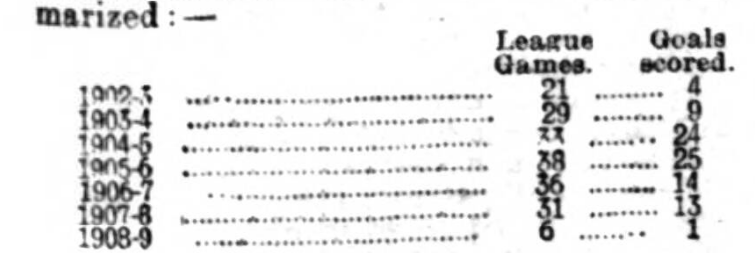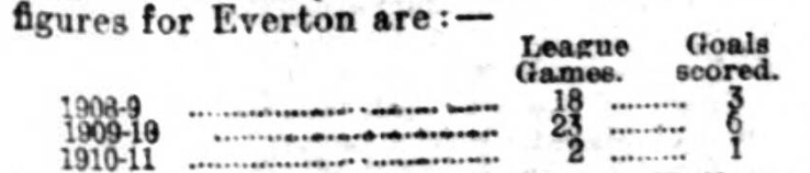 He played his last match with the Wanderers against Derby County on Oct. 17th, 1908, and on Nov. 25th was transferred along with Clifford to Everton, with whom he made his League debut against Sheffield Wednesday on Dec. 12th. His figures for Everton are: