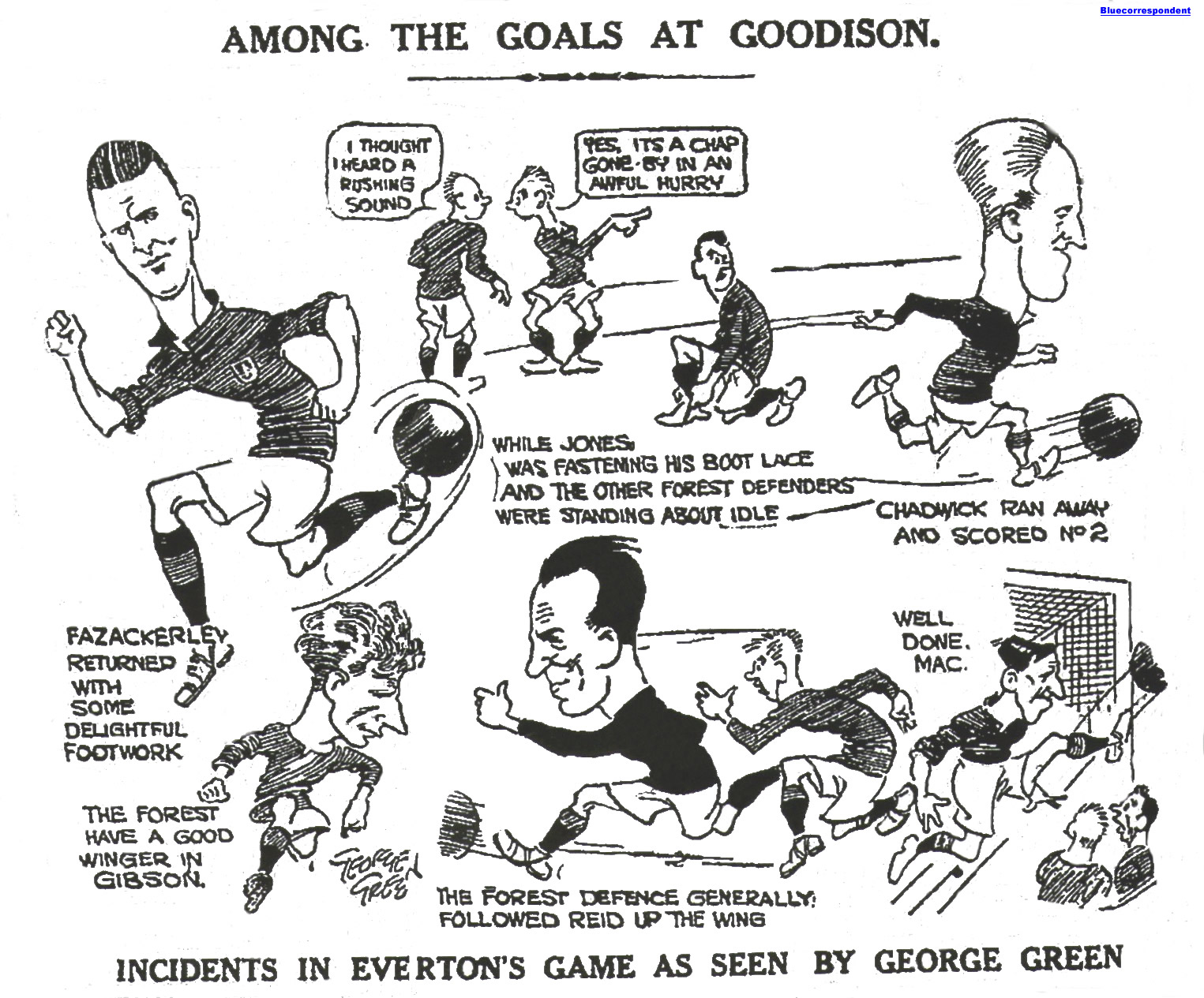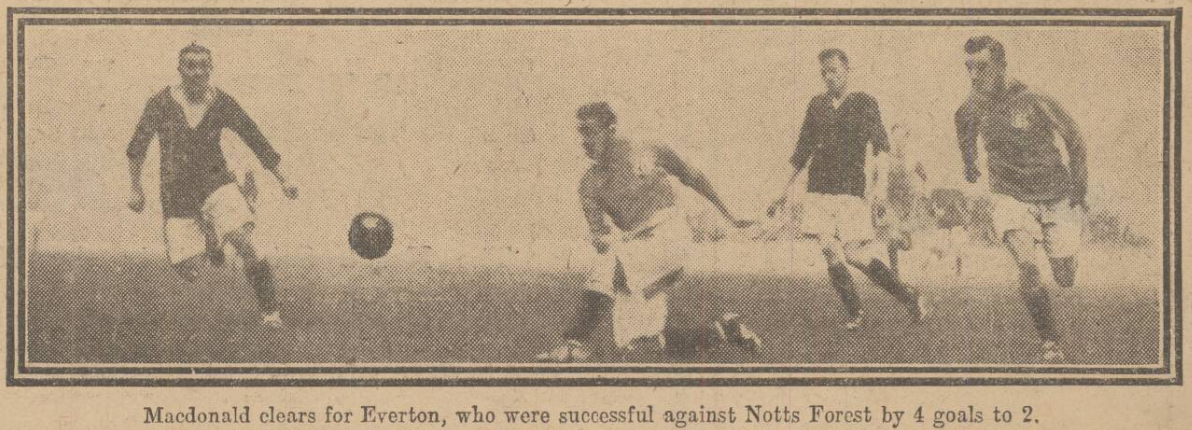 He was out on his own on the right wing when he saw a fractional chance, and he shot in fiercely and truly. It was a good goal, and reminded us that Forest had, with ten men, rubbed off two goals lead in the Preston match. The game was in a measure farcical because all the men, except the goalkeeper congregated like deacons in a vestry. They lined up round the centre man and played for keeps on the offside question. Everton’s best work was at outside left and right back. D. Reid was unfailing in his centres, and Raitt was admirable against two clever men. Everton should have been two goals up again, when Fazackerley bumped a full back off the ball and let in Chadwick, who was slow to take a right foot shot. Hart shot over, and the finishing touch before half-time was an escape for Everton when fern ran out and did not gather the ball, Gibson being quite near an equaliser.