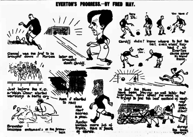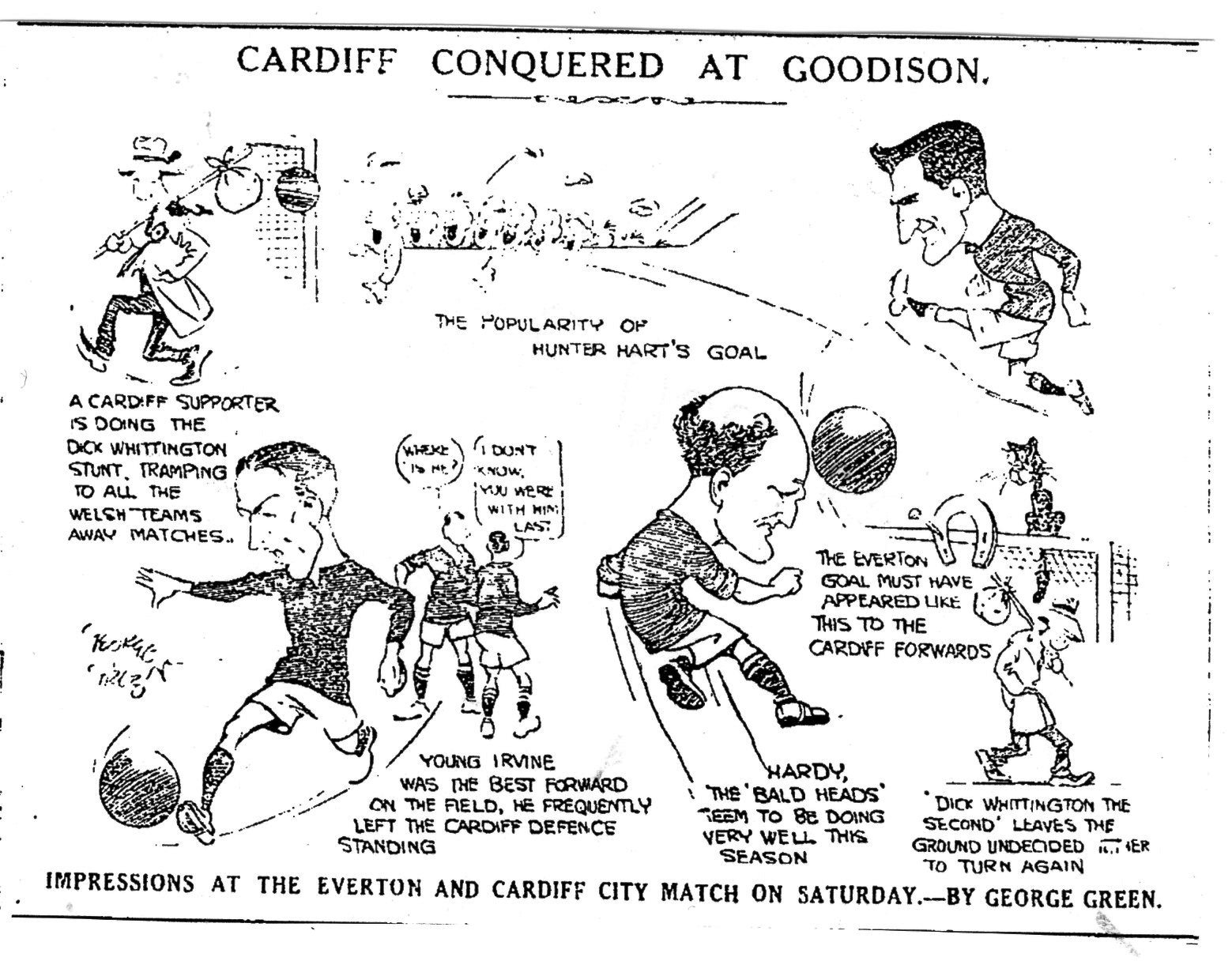 Fern deserves every credit for his part in the victory, his one-handed clearances from Gill at point blank range being a masterpiece, McDonald and Raitt did well, the latter being the most reliable. It should not be forgotten, however, that McDonald received some hard knocks during the game. Hart was the best of the halves, peacock did some smart things, but he was so prominent as on the previous Saturday. Fleetwood was always in the thick of the fray, and some of his passes to the wings were capital. The forwards worked together smoothly, the outstanding figures being Irvine and Chedgzoy. The Irishman was in very forceful trim. On the Cardiff side Page and Blair were a good pair of backs, and Smith proved a strong half-back. Forward the line moved smoothly in midfield, Clennell being the pick. Len Davies and Gill, however, appear to have lost their penetrative powers. Gill, owing to injury, finished up at outside right. Teams; Everton; Fern; Raitt and McDonald; Peacock, Fleetwood, Hart; Chedgzoy, Irvine, Forbes, Williams, Harrison. Cardiff City; Davies (D); Page and Blair; Keenor, Smith, Hardy; Grimshaw, Gill, Davies (L), Clennell, Evans.