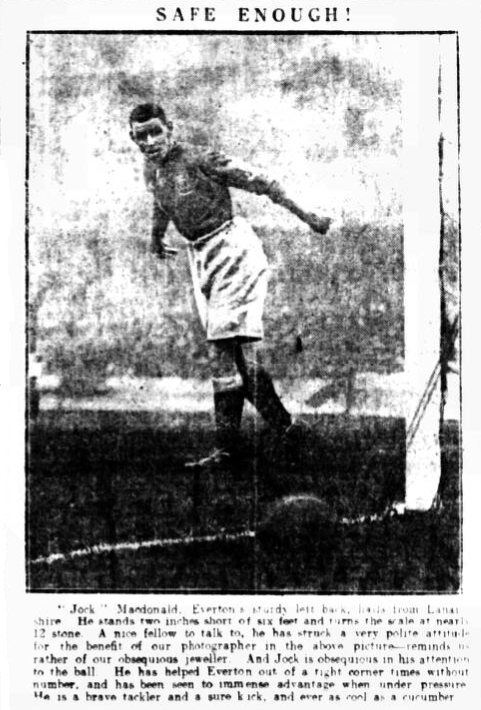 Apparently there are other things in the air beside a cold nip. A Scottish correspondent says that Everton are still beat upon getting J. McDonald, the Airdrie pivot. This strapping centre-half is just an inch short of 6ft in height and he weighs 12st. Up to the week-end no centre forward had scored against Airdrie, and Scots say that this was due to McDougall’s work. Irvine by the way has been down with a bad ankle, and Bill Lacey on Saturday told me that he believed he would be right for play in a fortnight. Harry Lewis has been ill through tonsilitis, I am told that his younger brother is doing grand work for Clover’s.