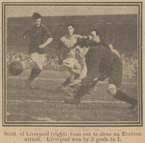Fern had made a great save from Chambers when Forshaw crossed the ball, and Fleetwood headed towards his own goal. The ball was stationary a yard or two from the line, but Fern managed to snatch it away from Johnson. Yet in a somewhat similar incident immediately afterwards McKinlay left his pass back to Scott short WILLIAMS and Forbes dispossessed the goalkeeper, and the former simply tapped it into the net. Thus Everton were in excelsis after seventeen minutes. In spite of enjoying their share of the game, Everton were oftener in peril. When McDonald stopped McKinlay’s free kick alongside the post, Lacey should have equalised, and shots by Forshaw and Bromilow swept barely wide. However, two or three minutes after the interval, Liverpool were on terms-and something more. A suspicion of offside attached to the birth of a movement whereby Hopkin dashed off and forced a corner. Chambers headed in and Fern handed the ball out, but again CHAMBERS headed, and although Fern pushed the ball away it was only after it had dropped from the roof of the net. Curious eventful goal rang the knell of Everton. Now Liverpool were a fascinating, mystifying cohort, and Everton’s inside wing forwards were compelled to retreat. The second goal, materialising after twelve minutes in the second half, was brilliantly scored by McNab. It’s genesis was in the novel movement which I have previously commented upon. Drawing the defence, lacey slipped the ball forward for the half-back to anticipate and career through. McNab sped towards Fern, drew him, and then shook the net with a terrific drive. Then some dashes by Everton were no sooner near fruition than Forshaw’s artistic individualism enabled Lacey to centre, Johnson to head on to CHAMBERS, and the last named to crash the ball home. A minute later CHAMBERS was clearly about to pass, but instinctively pivoted, and best Fern with a shot that swerved in a direction opposite to his expectations. But the keeper should not have been taken by surprise when BROMILOW did a similar feint, Fern was too late for a ball of no pace. Therefore Bromilow celebrated his birthday appropriately. Comparatively, Scott had an easy time. Quite his best feat was to prevent an apparently unredeemable shot by Williams finding its billet in the last minute. He was unlucky to have to surrender one goal. Fern, however, was almost incessantly in action. Though he made mistakes, they should be compared with what he achieved. Incongruous as it may appear, alongside the score, the Everton backs played brilliantly. Indeed, this department on either side presented one of the most alluring features, and it is difficult to differentiate.