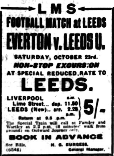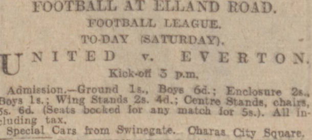 It was an off-day for the team in most respects.  Everton, on Saturday’s form, should meet with further success. They played quite good football. It was Irvine who put them ahead shortly before the close.  He took advantage a reluctance on the part of the Leeds defenders to challenge him, and netted. Dominy added a third a few minutes later.  Leeds United.—Potts; Roberts, Allan; Edwards, Townsley, Menzies; Sissons, Duggan, Jennings, Wainscoat, and Turnbull.  Everton. —Davies; McDonald, Kerr; Brown, Hart, Virr; Millington, Irvine, Dean, Doming, and Troup.  Referee: J. E. Williams, Liverpool.