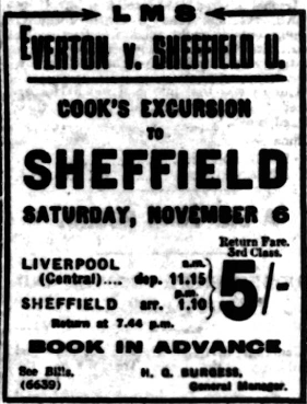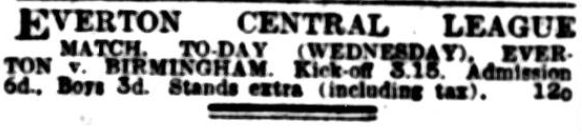 Everton and Bolton met at Goodison Park, to-day, in a Lancashire Cup-tie (Phones “Bee”).  Everton brought in Peacock at right half, David Reid at inside left, and Raitt at full back.  Bolton had a strong side, even though David Jack was absent.  Everton; B. Howard Baker; Raitt, Kerr; Peacock, Hart (Captain), Virr; Millington, Irvine, Dominy, Reid, Troup.  Bolton Wanderers; Pym; Greenhalgh, Finney; Cope, Round, Nuttall; Butler, Baggett, Smith (J.R). Wright, Vizard.  Everton won the toss, and Irvine and Troup were early in the good books of the crowd.  Finney, formerly of New Brighton, seems to have regained his old-time form after his operation, and although Round was not a Seddon his height carried him far.