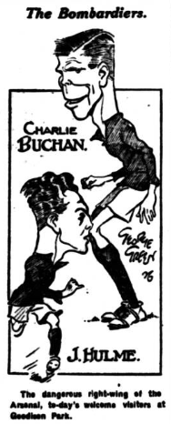 Everton; Davies; McDonald, Kerr; Brown, Hart (Captain), Virr; Moffatt, Irvine, Dean, Dominy, Troup.  Arsenal; Harper; Parker, John; Young, Butler, Blyth; Hulme, Lambert, Brain, Ramsey, Haden.  The football “gag” of the last four seasons has been “Give it to Dixie!” It became a classical phrase, and by degrees it dawned upon the public that this was in reality a testimony to William Dean (otherwise “Dixie”), of Everton F.C. fame, for this was the method by which the goals would be scored.  Dean was the reverse side of this to-day, when he reappeared for the senior side at home for the first time since his terrible motor-cycle accident.  The crowd fairly “Gave it to Dixie,”