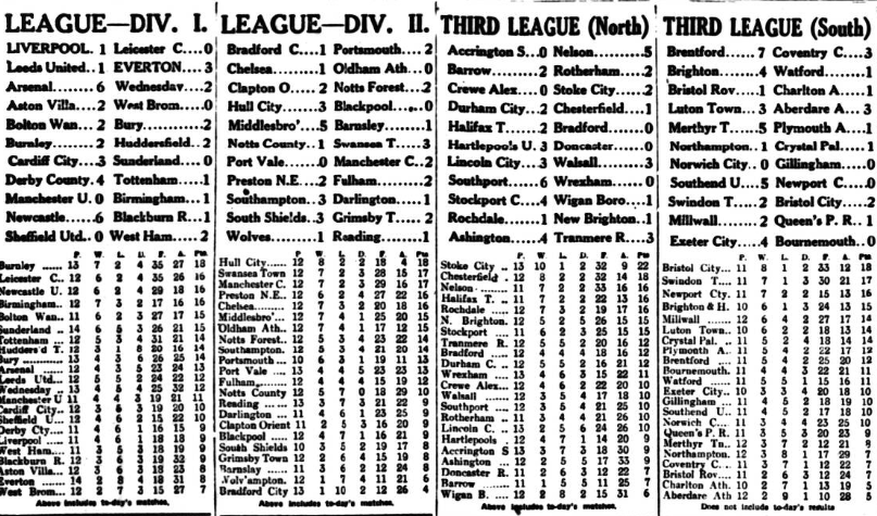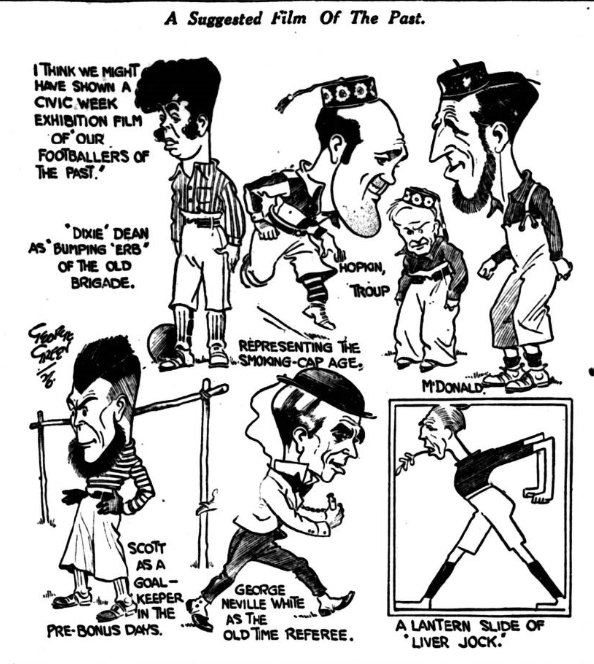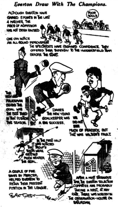 One cannot get away from the Deanery; it sticks out where’er you go.  Is he fit? Is be fat?  Is he confident? How’s his head?  All these and scorers of other queries are prompted to this column through the ever-increasing popularity of Dean, whose very presence last week served to being a life to the Everton attack, that had been deathly instead of deadly up to that point.  Dean is assured a great reception to-morrow, so is Hart, the holder-up of centre-forwards –Gallacher and Jennings in turn and, with power to add to their number, one Brain to-morrow at Goodison Park.  Brain has burst upon the world again this season as a netter of goals; he fails at times, but so many risk shots does he take that no one can grumble if he gets one in six in the right place.  Buchan, of course, will be the cynosure of all eyes, and altogether the match promises to produce Everton’s richest financial harvest, and more important still, to produce a further home victory.