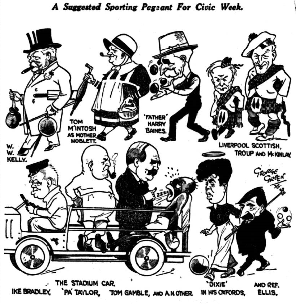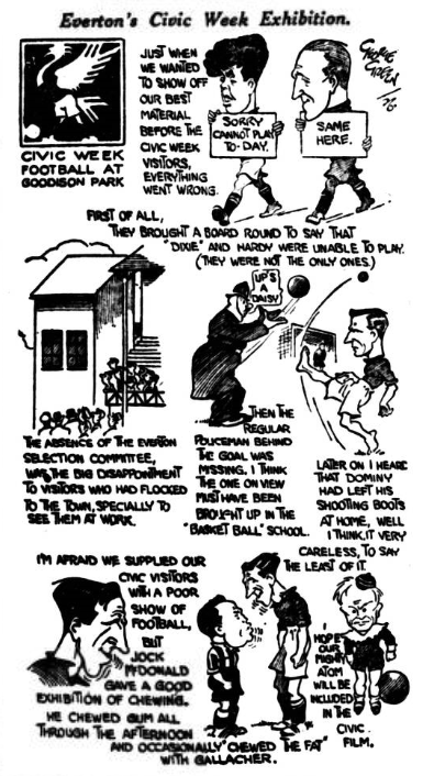 In football history tomorrow marks a very important day in the life of the Everton football followers; Dixie Dean returns to senior football life before his own crowd.  A fortnight ago something similar was expected, and ankles laid Dean by the heel, if I might put it that way.  Now, however, there is no doubt about Dean’s reappearance and that being so, a record crowd is almost assured, Everton having struck a blow at Leeds that has heartened everyone connected with the club.  Arsenal will always remain an attraction.  When they were going badly and came to us with relegation tongues shouting at them they were still a side to watch, because they had brought Ramsay and others, and had broken their recognized rule-as per Sir Henry Norris- of not paying more than a certain figure for a new player.  Since Mr. Herbert Chapman took over the reins at Highbury things have been moving apace.  He has not exactly got the full-quality results he desired, but he is marking time with the wide that is at his disposal, and in the end will get the blend he requires- the blend he mixed at Huddersfield, a foundation-stone laid as securely as that of our cathedral! Mr. Chapman’s arrival at the Arsenal ground has led to many improvements, many new ideas, and a cleanliness that is an object lesson.  All that remains now is the building up of a side that shall entrance Arsenal spectators, for the crowd is there, and with a winning side Highbury becomes a really well-packed enclosure.