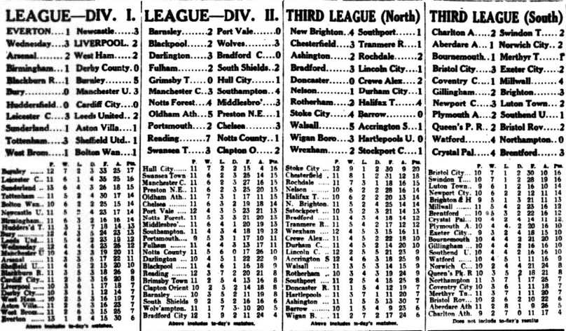 Oh joy! Everton and Liverpool won on Saturday, and, as injuries have not struck either side at the week-end, there is no alteration in the teams for about the first time this season.  The directorial meeting, so far as the team-sheet is concerned, must have lasted one minute.  That is a happy release from previous meetings! Such is fame! I have a cord this morning, delivered by the P.O., addressed “Bees, Rose Growers, Liverpool,” asking for a rose catalogue.  I am sorry to say I cannot recommend my roses this year.  As Alf Lester used to sing, “The wind, which was abdominal, came along and blew them all, all down; and the pernicious anaemias, and the purple quinzies, like the double pneumonias, have been much below customary strength.”  Following their success at Leeds last Saturday, Everton have a most attractive home match against The Arsenal this week-end, and the directors last night decided to reply on the team which defeated Leeds United.  Dean, will, therefore, make his first appearance in a League match at Goodison Park this season.  The team is;- Davies; McDonald, Kerr; Brown, Hart, Virr; Millington, Irvine, Dean, Dominy, Troup.  The Arsenal have recovered their best form, and the fact that they sixed six gals against The Wednesday shows that the forward line is most thrustful.  Brain, the Highbury club’s leader, obtained four goals last Saturday, so that Hart, for the third week in succession, will be faced by a goal-scoring centre-forward.  The London club has, so far, won four matches and drawn five of their twelve games.  Harper, the Arsenal goalkeeper, has declined his Scottish cap in order to assist his club at Goodison Park.  The Everton Reserves team to meet Bury in a Central League match at Bury on Saturday is; Hardy; Raitt, O’Donnell; Peacock, Bain, Rooney; Moffatt, Woodhouse, Tyson, Houghton, Kennedy.  Tyson is a local player who has assisted the A team and who played well in last Saturday’s match at Goodison Park.