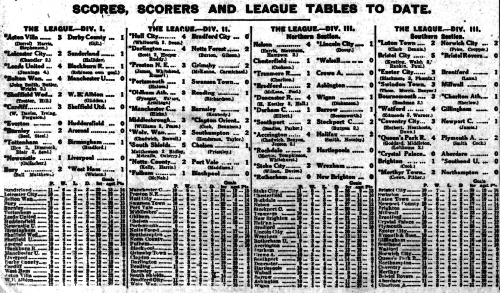 Incidentally-and this is mine, not Mr. Cuff’s it is interesting to remember that Everton are often charged with paying fanciful prices, yet the team that won at Leeds was far from costly.  The goalkeeper cost nothing, and is doing very well –congrats, to Davies; Kerr was bought for “a song,” Brown and Virr were without price and with much benefit; in the forward line Millington cost a trifle, Irvine nothing, and Dominy nothing.  That’s not so bad for a supposedly expensive side, in view of Buchan’s and Arsenal’s appearance at Goodison Park, together with the “welcome stranger” Dean.