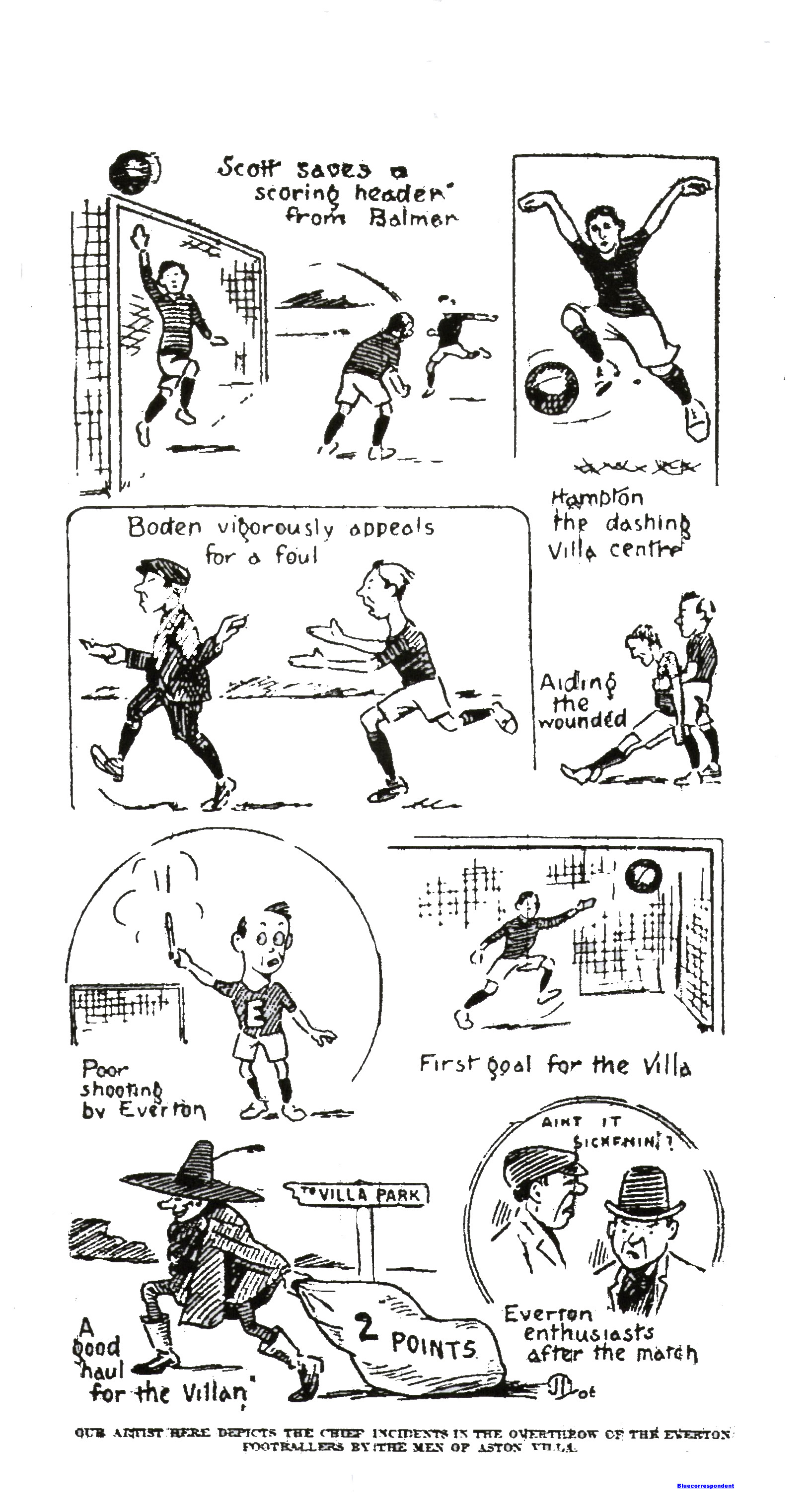 Had we had the least luck we should have been leading 2-1. Still, Parkinson scored a beautiful goal. We Evertonians can appreciate good goals- even when they are against us. Wally Abbott was at this time the best half back on the field. Hardy was well beaten when he skimmed the bar with a rare express. Half-time is on us, and Robinson fouls the ball. Penalty! Abbott take it! Hardy saves! Tut, tut! Everton could do anything but score. One down, and forty-five minutes to play. We shall see.