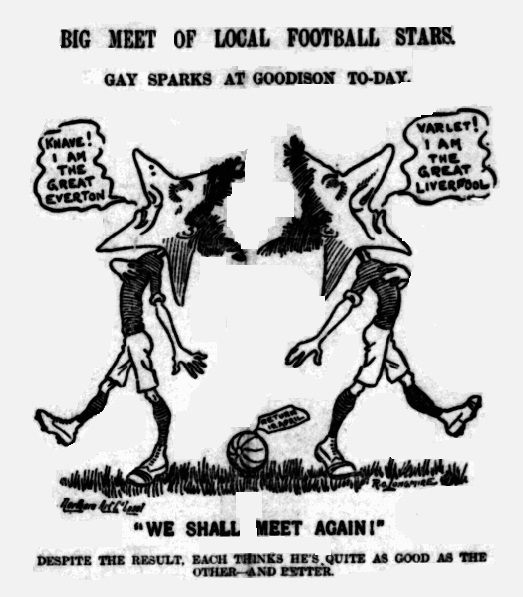 The first of two League fixtures between our local eleven's was down for decision on Saturday at Goodison Park, the event ranking as one of the most important, certainly the most interesting to Everton and Liverpool. The reason for this is not far to seek, for there is the greatest rivalry-healthy rivalry by the way-between the two contending teams for the better position in the League table, and both sides were expected to try their hardest for supremacy. Everton only made one alteration in the team which drew with Wolves last week, Sharp resuming in his old place on the right, vice Rankin, who gave such a good account of himself a week ago. Settle was still an absentee, Sherdian again appearing at inside left with Bell. Liverpool put in a stronger team, though it was seen that Morris was operating for Chadwick at inside left. The day was very favorable for the game, though a trifle warm, but notwithstanding this there was an immense crowd. The teams were: - Everton: - Kitchen goal, Henderson, and Balmer, backs, Taylor, Booth (captain), and Abbott, half-backs, Sharp, Brearley, Young, Sheridan, and Bell, forwards. Liverpool: - Perkins, goal, Glover, and Dunlop, backs, Parry, Raisebeck, and Goldie, half-backs, Goddard, Livingstone, Raybould, Morris, and Cox, forwards .