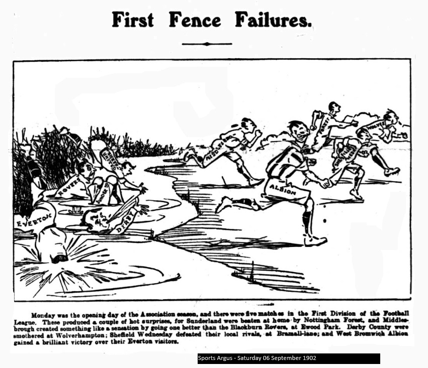 West Bromwich opened their season on their own ground yesterday, having Everton as their opponents and the game attracted about 15,000 spectators The Albion opened with making several smart attacks. Lee shot over the bar and later put the ball through, but the point was disallowed for a previous foul. At length McLean beat the Everton goalkeeper, and Simmons headed through second point. At half-time Weal Bromwich Album were leading two goals to none. After changing ends a penalty kick was given against Palmer, but the Everton goalkeeper was equal the occasion. For a while the Albion were the smarter their movements, but eventually Everton made strong attack, and Young scoring in easy fashion. That being the only score in the second half. West Bromwich Albion won a good game by two goals to one.
