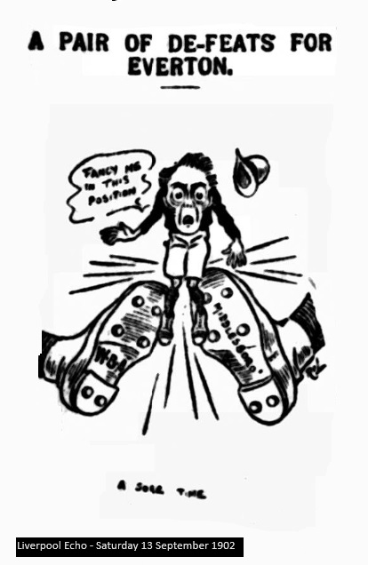 With 40,000 people round the ropes at Goodison Park, and a splendid victory over Liverpool, the Everton executive, their eleven, and their enthusiasts were in high glee on Saturday evening when John Lewis sounded orders for the cessation of the strife. ‘Tis true that neither of the great teams quartered on the banks of the Mersey have given unallowed pleasure to their supporters during the month. In fact, they have been sadly disappointing; but how could Everton begin their garnering of points better than by inaugurating their victories in this manner? A triumph of 3-1 over the Anfield combination covers a multitude of sins, and hope will once more dispel despair in the neighbourhood of Walton. Moreover, Everton had the unexpected pleasure of a son of a peer being so gracious as to kick off on this great day. In the morning there was a telephone message from Knowsley asking for three seats to be reserved. Evidently the describes against professional football have not convinced the house of Stanley. Indeed, the Hon F. Stanley came into the arena with Dr. Baxter, and gave motion to the new ball as if he had kicked one before-probably at school. But then the young scion of a noble family left the fray to the “trained footpads” some of whom acquitted themselves nobly, and one, I regret to say, rather ignobly. But that is another story. During the week there had been much discussion as the composition of the teams, but when the men filed on to the turf one after the other to please the cinematograph operator, it was seen that Edgar Chadwick and James Settle were the only notable absentees. Settle has a bad knee, and no joint in the human body is worse to manage, I remember an athlete declaring with a touch of humour that the knee was the worst thing ever invented. Perhaps Settle could confirm this opinion. But Chadwick is worrying about the tenderness of his toes for these were badly hurt in the match between Liverpool and the Edinburgh Hibernians. He ought not to have played against Stoke, but the club was in such difficulties that he did –and since then he has had leeches applied and been wearing boots of a No. 19 size. These are the ills which footballers are heir to. And then some folks prattle of the joys and the emoluments of the professional “footpad!.”